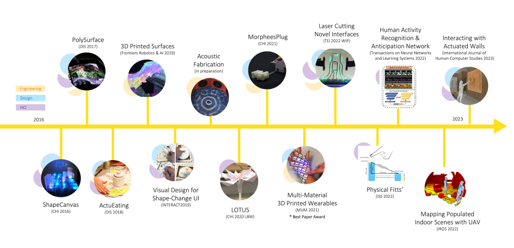 With nearly 10 years of experience conducting both quantitative and qualitative research, my work focuses on the development of new digital fabrication methods for novel technologies such as shape-changing displays and wearables. My research has been published at venues across in Human-Computer Interaction, Interactive Systems Design, Robotics, & Computer Vision.